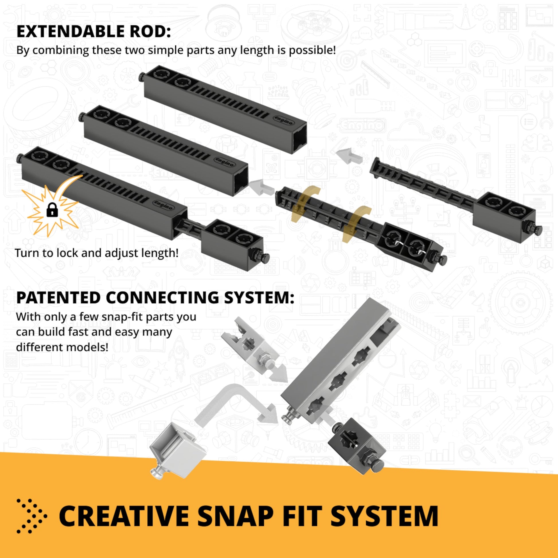 Score depends on the number of parts and connecting points The ENGINO building system has a patented design of the parts which allows connectivity of up to 6 sides simultaneously, while the unique extendable components lead to builds that were previously unthinkable, unleashing kids' creativity and imagination. Sets include printed step-by-step instructions for the main models, but also online through our kidCAD™ interactive app.