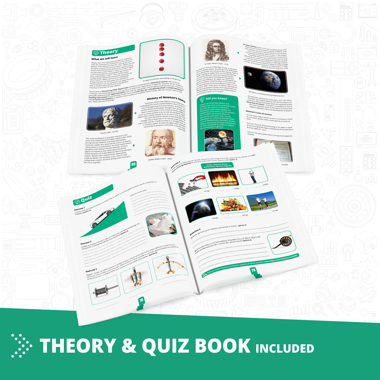 • Lernheft mit physikalischen Theorien, Experimenten, Quizfragen und gedruckten Anleitungen. Vom Bauen → Testen → Reflektieren.