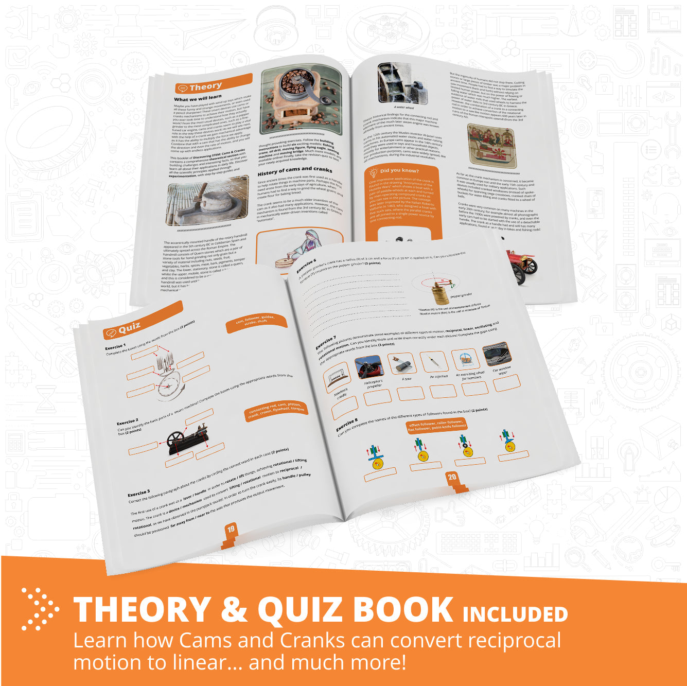 • 122 Engino-Teile zum Bau von 8 Modellen (eins nach dem anderen) zum direkten Erlernen der Physik hinter Nocken und Kurbeln.