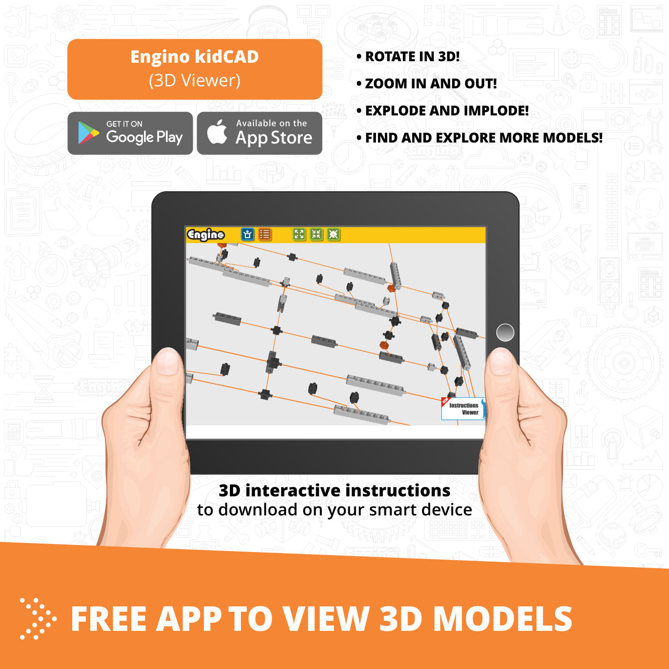 3D-Anweisungen über die Engino kidCAD (3D Viewer)-App zur Rotations- und Zoom-Anleitung.