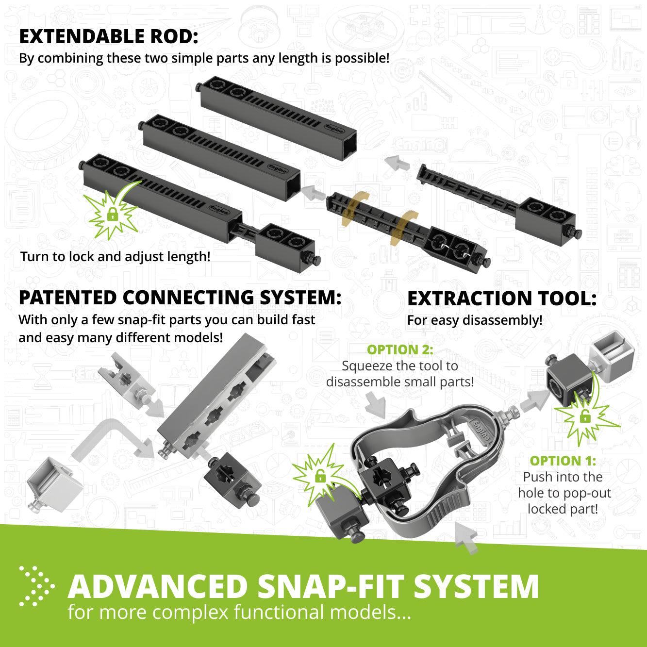Score depends on the number of parts and connecting points The ENGINO building system has a patented design of the parts which allows connectivity of up to 6 sides simultaneously, while the unique extendable components lead to builds that were previously unthinkable, unleashing kids' creativity and imagination. Sets include printed step-by-step instructions for the main models, but also online through our kidCAD™ interactive app.